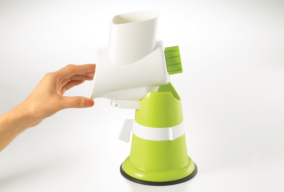 RedDot Design award. Innovative angled design for high efficiency! No mess in use! Slice & grate food in seconds. Build on sturdy auto-lock suction base. Simple to install and use. All parts detachable! Easy to clean! Suitable for cheese, vegetables, nuts and more.